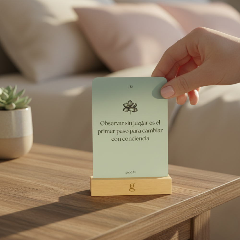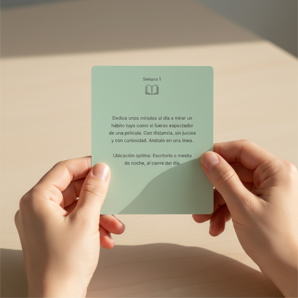 Coloca la carta de tu semana donde la veas. Un recordatorio sencillo para mantener el hábito presente sin esfuerzo.